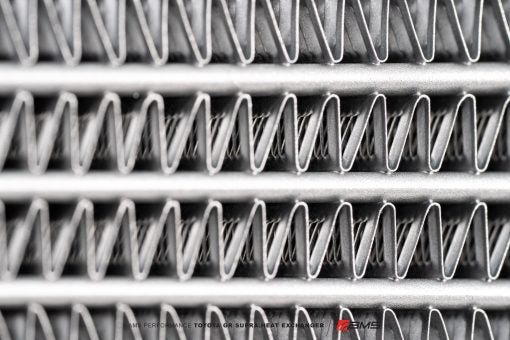 The most important part of an air-to-water intercooler system is the heat exchanger core. Skimping here could mean the overall performance of an ‘upgraded’ system might be worse than stock! This high efficiency, dual pass core allows coolant to make two passes through the heat exchanger before exiting, dissipating heat quickly for maximum cooling. Our team tested numerous core types with varying sizes and features to guarantee the highest performance possible. The AMS Performance Toyota GR Supra Heat Exchanger utilizes a 5mm tall louvered fin which allowed for the best heat transfer and coolant tube count of any fin design we tested. Additionally, this louvered design allows for extra surface area which promotes more efficient heat transfer out of the core.