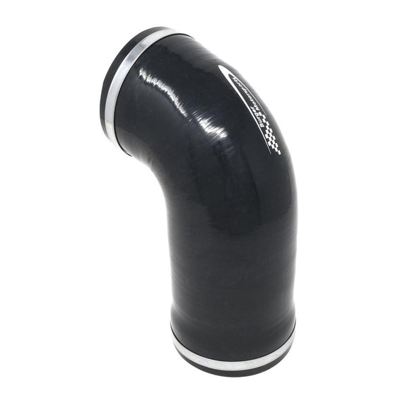 The Burger Motorsports B58 silicone intake pipe upgrade smooths the airflow from the intake to the factory turbo inlet by removing the upper factory sound resonator and the lower accordion section of the air inlet pipe.