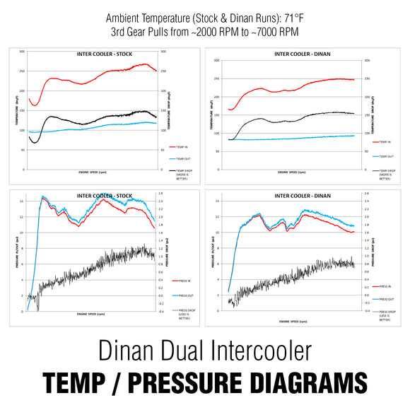 Greater power gains are achieved with a larger high-performance intercooler. The Dinan dual core intercooler provides a 240% increase in face area along with an equally impressive increase in volume, substantially reducing the pressure drop to 0.8 psi, as well as providing for more efficient heat exchange and more consistent output power. Dinan's unique dual-core design allows 2 separate cores to be working in conjunction with one another at all times. This doubling of resources is directly responsible for a 60% improvement in the delta from charge air temperature to ambient temperature (see diagrams). "Cool down" time is also reduced, enabling the cars to produce full power under varying driving conditions such as stop and go traffic. This leaves the chances of being susceptible to heat soak nearly a thing of the past. The system has been engineered to be as direct a replacement as possible to the stock unit, requiring only minor modifications for a clean, factory-like installation. The increased thermal efficiency provided by the Dinan dual core intercooler will also enhance turbocharger reliability in addition to overall power. On a stock vehicle, power gains can be had from 4000 RPM and beyond (when the car is in boost). In order to achieve the best performance, the intercooler should be paired eith engine tuning as it can provide additional optimization of the intercooler. In particular, with Dinan flash software the power band is extended to be more robust and powerful from 5000 RPM to redline whereas without tuning the bulk of the gains are from 6000 RPM to redline.