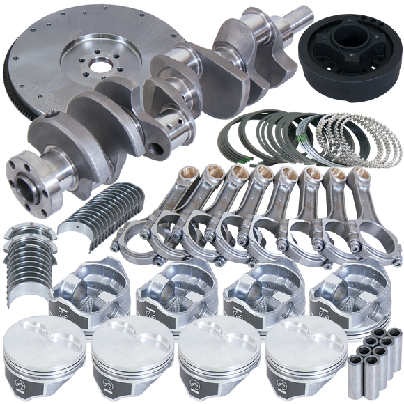 BALANCED 3.400" CAST CRANK,5.400" I-BEAM RODS,3/8" ARP 8740 BOLTS,HYPEREUTECTIC SPEED PRO -5CC FLAT TOP 4.030" PISTONS,PLASMA-MOLY STANDARD GAP RINGS,KING SI ROD/MAIN BEARINGS, PIONEER DAMPER & 164 TOOTH FLYWHEEL.