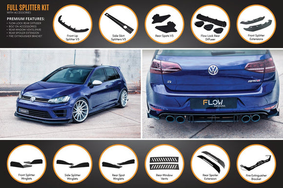 The Flow Designs splitter set is the best exterior mod for your VW MK7 Golf R! With front & side splitters & rear valance, Flow Designs offer the strongest splitters on the market. All our splitters are made from a thick polyethylene composite, making it the strongest product of its type on the market, watch our stress test to see how durable our splitters are.