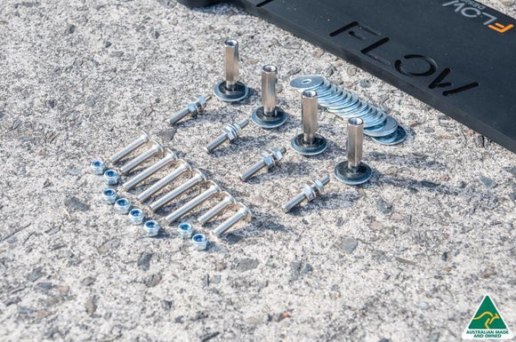 Our secret is in the cross bar studs. 4 stainless steel studs matched with coupling nuts are bolted directly into the lower OEM crossbar. This allows the splitter to attach directly onto a solid metal section of the vehicle whilst also supporting the front bumper.