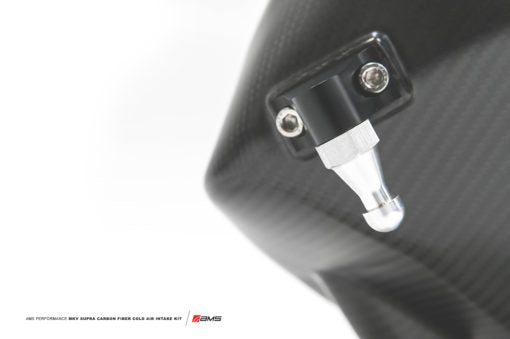 The new large AMS airbox was specifically designed to distribute airflow evenly over the entire circumference of the intake filter by allowing air to swirl around it. This means greater distribution of cold airflow across the filter resulting in lower pressure drop and a longer filter life between cleanings.The AMS Performance MKV Supra Carbon Fiber Intake Kit is engineered to deliver a 25% reduction in pressure drop which leads to better efficiency and more power. Because the Supra uses a torque based ECU tuning strategy, our SnailWorks© Engineering Team has found that horsepower is not significantly changed with any aftermarket engine components unless proper ECU calibration is made to take advantage of the new hardware components. Our team even went so far as to add a much larger turbocharger to our test Supra, and found 0 hp gains without tuning. Do not be fooled by competitor’s claims of horsepower gains without ECU calibration! Our Engineers designed the fully enclosed dry air filter to draw in a larger volume of air into its hand laid carbon fiber constructed cold air box. The matte carbon finish perfectly matches the AMS MKV Supra Carbon Fiber Engine Cover.