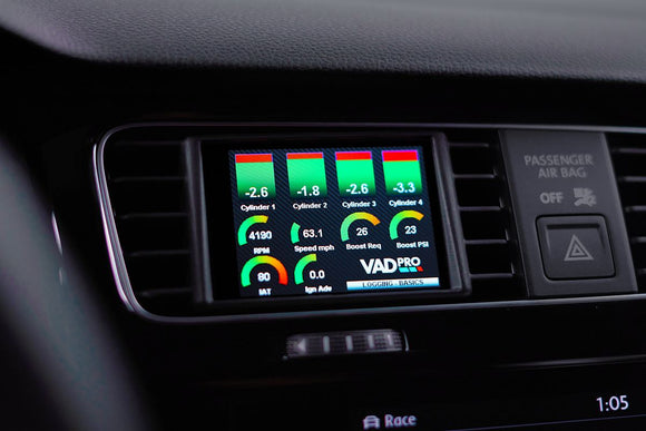 VADpro can display up to ten pages and has access to 64 of your vehicle's sensors. Use the touch screen to navigate between each page and choose which sensor you want to display. Need more customization? You can personalize your views by changing the graphics, sensors and widgets using the provided DSS software. We've pre-loaded some examples on your VADpro to get you started.