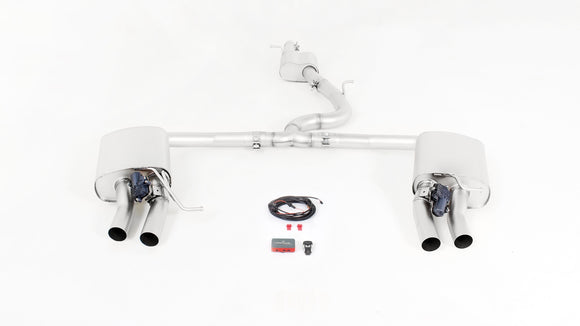 - RACING sport exhausts left & right (selectable tail pipes), with 2 integrated electrical valves, without homologation. Incl. REMUS sound controller